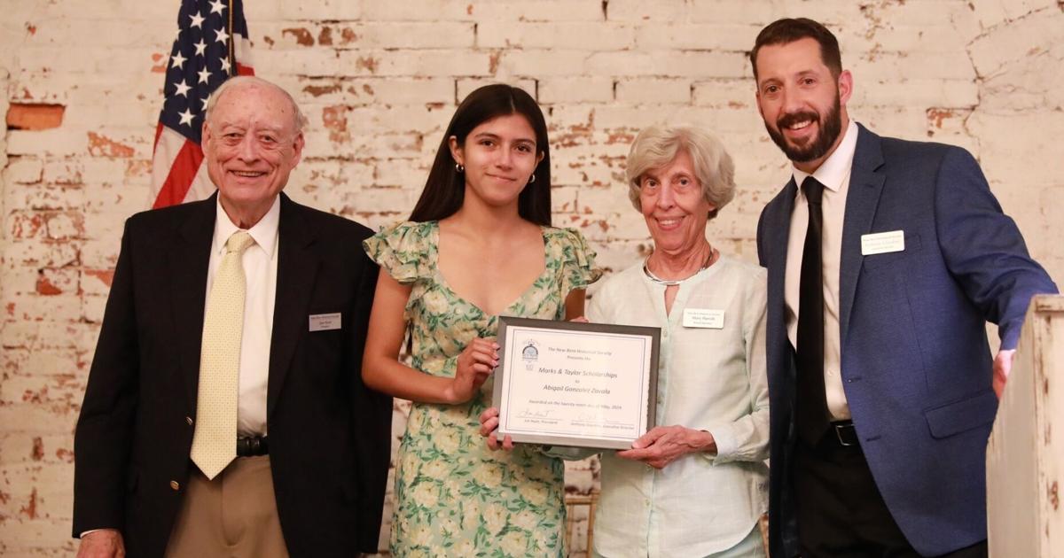 Members of the New Bern Historical Society pose with the 2024 Marks and Taylor Scholar. Pictured, from left, are treasurer Joe Hunt, 2024 Marks and Taylor scholar Abigail Gonzalez-Zavala, Scholarship Committee chair Mary Parrish and executive director Anthony Giardino.