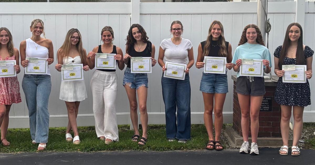 The New Castle Wolves Club Den 1 provided scholarships to 11 students from Lawrence County school districts. Pictured, from left, are Don Prejsnar, Wolves Club president and scholarship committee member, Nevaeh Grimes, Julia Graham, Shyanna Graziani, Mariah McIltrot, Lily Smolnik, Hailey Collins, Lia Krarup, Kylie Fruehstorfer, Gracie Nicholson and Chris McIltrot, Wolves Club scholarship committee chairman. Missing from the photo are scholarship recipients Trentan Wolfe, Mason Petrone and Rachael Callahan.