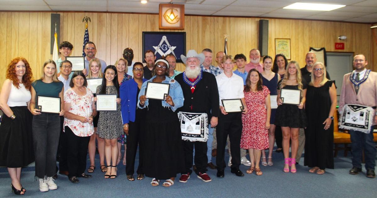 Award recipients with their families and members of the Masonic Lodge at the League City Masonic Lodge Mirabeau B. Lamar Award and Scholarships banquet dinner held on April 28.