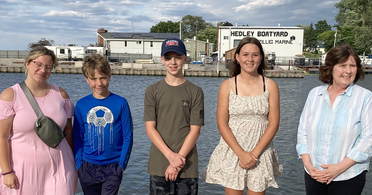 At the Olcott Yacht Club, Junior Sailing head instructor Ella Thibault stands with 2024 scholarship recipients Logan Puchlerz, Joseph Morello and Taylor Ernest and OYC Women’s Yachting Association chair Linda Rosenbaum.