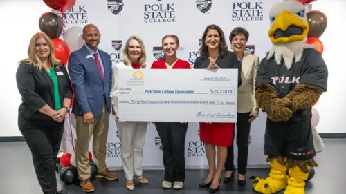The Polk State College Foundation celebrated a generous contribution of $35,278 from the Florida College System Foundation on Wednesday in the Winter Haven Fine Arts Building among students, faculty, and staff who expressed gratitude. These funds will support three transformative scholarship programs that continue to expand access to higher education for students across Florida.