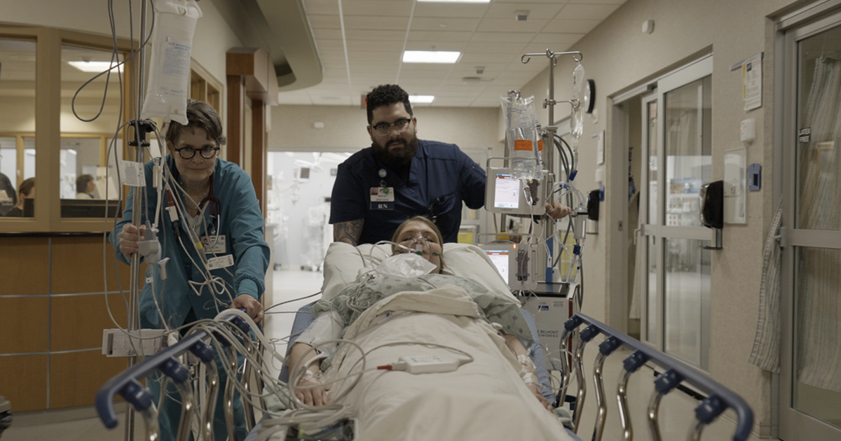 Gail Bisbach and Emilio Ramirez, both RNs, wheel a patient from the emergency department to radiology.