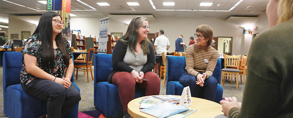 It’s quiet in the Research and Creativity Collaborative (RCC), but its mission – to highlight UMW’s emphasis on scholarly endeavors and artistic success – comes through loud and clear. A touch-screen kiosk allows access to a repository of original research and student artwork adorns the walls, while hanging plants, table lamps and comfy seating paint a collaborative mood.