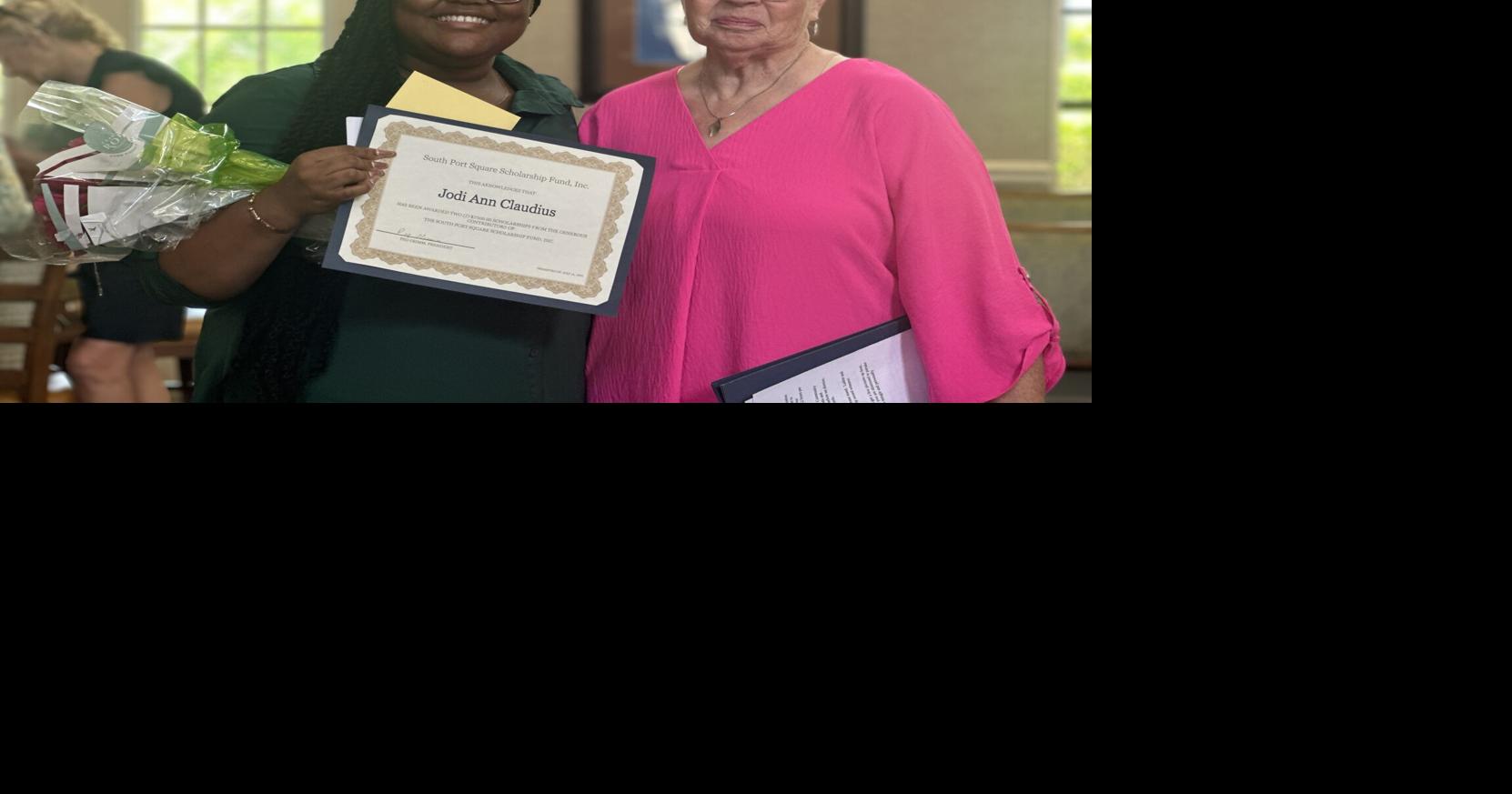 Jodi Ann Claudius, an employee at South Port Square, stands with Peg Grimm after receiving a scholarship from the South Port Square Scholarship Fund. Grimm is president of the Scholarship Fund and chair of the Resident Committee.