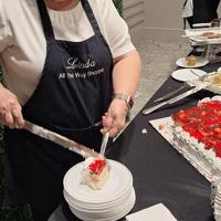 Linda Aldridge prepares dessert for hundreds at the February 15 Shelbyville Rotary Club Dinner and Auction.