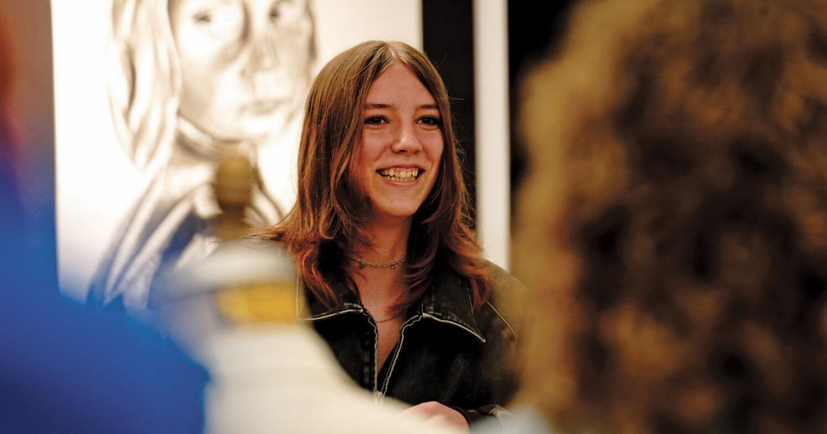 Big Horn High School student Kenley Barney is pictured next to her artwork at SAGE Community Arts. Barney and two other BHHS students were awarded Sheridan College scholarships.
