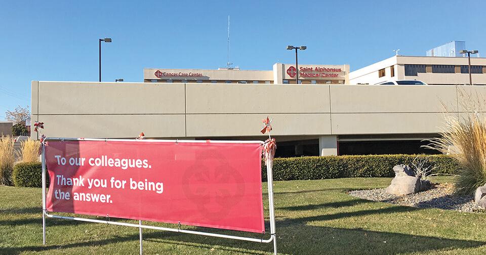 The sign outside Saint Alphonsus Medical Center-Ontario has a message to colleagues “Thank you for being the answer.”