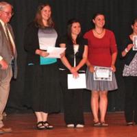 Dick Michaud presents four scholarships, totaling $2,250, on behalf of Shavano Academic Booster Club Monday night in John Held Auditorium. Recipients are, from left, Danyel Enz, Lexi Trujillo, Heidi Gilmore and Michaela Weber.