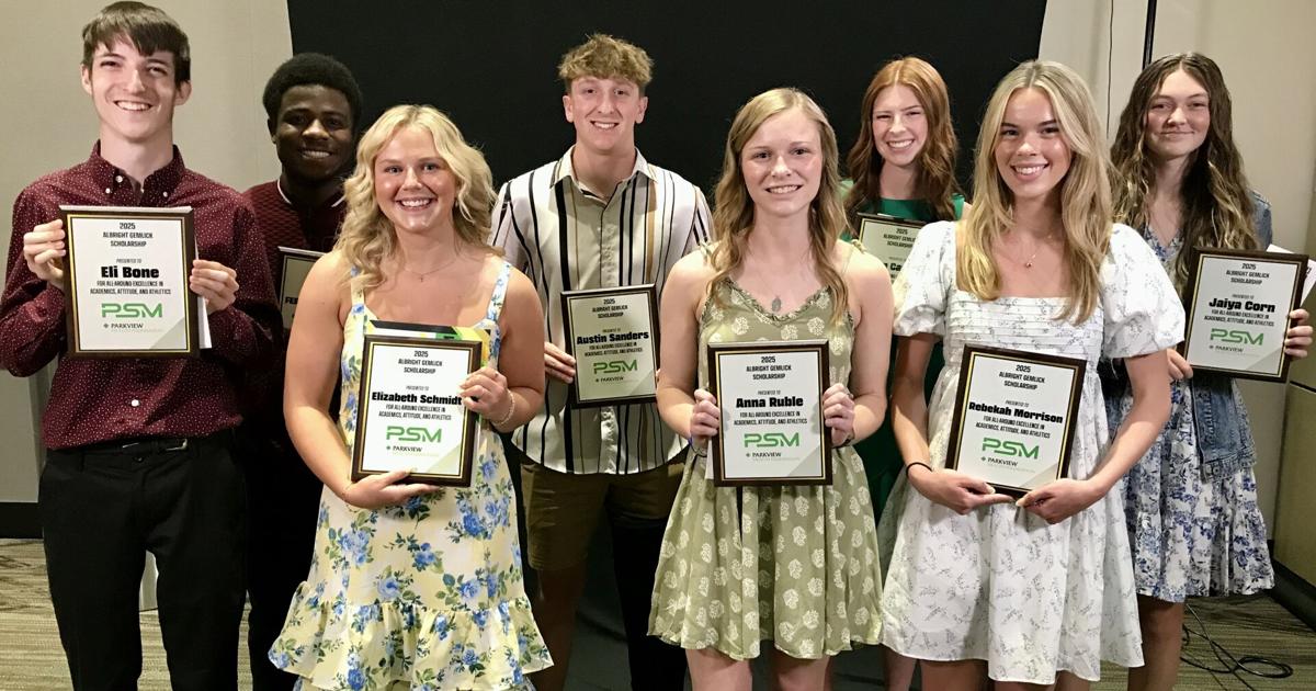 Hicksville senior Austin Sanders (fourth from left) was one of eight winners of the Albright Gemlick Scholarship awarded by Parkview Sports Medicine on Tuesday at the Parkview Mirro Center in Fort Wayne, Ind. The $8,000 scholarship was awarded to student-athletes nominated by PSM athletic trainers assigned to the seniors’ schools and Sanders, who will attend the University of Akron in the fall, was one of eight winners among 55 nominees representing 32 high schools. Athletes eligible for the award must have participated in one sport in their senior year and hold at least a 3.2 GPA on a 4.0 scale. The other winners hailed from seven other Fort Wayne-area high schools (Snider, Concordia Lutheran, East Noble, Southwood, Belmont, Northfield and South Side).