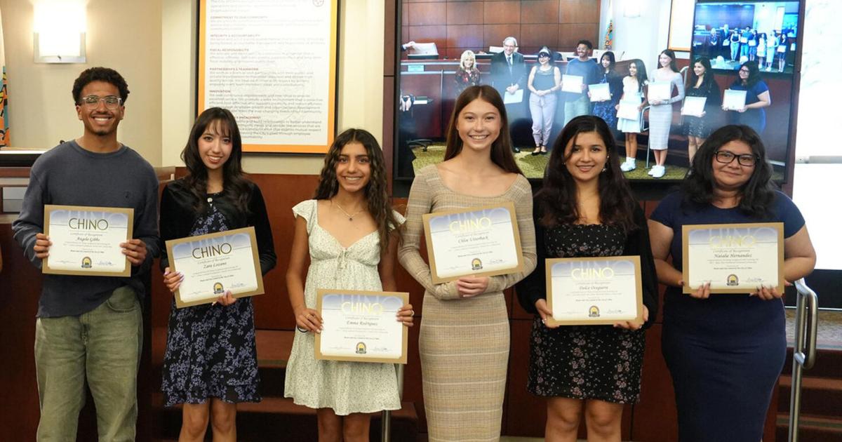 Recipients of the Chino Cultural Foundation’s scholarships were recognized at the June 3 City Council meeting. Shown (from left) are Youth Arts Scholarship recipients Angelo Gibbs, Zara Lozano, Emma Rodriguez and Chloe Utterback; Gretchen Hartt McCombs Memorial Music Scholarship recipient Dolce Oceguera; and Rose Ann Hammond Memorial Scholarship recipient Natalie Hernandez. Not shown are Youth Arts Scholarship recipients Floria Cao and Charlotte Hernandez. The Youth Arts Scholarship is awarded to students in music, theater or visual arts programs for training, instrument purchase or rental; the Rose Ann Hammond Scholarship is awarded to a graduating Buena Vista High School student pursuing education, training or a career in the arts; and the Gretchen Hartt McCombs Memorial Music Scholarship is awarded to a graduating senior or college student enrolled in a university as a music or music education major.