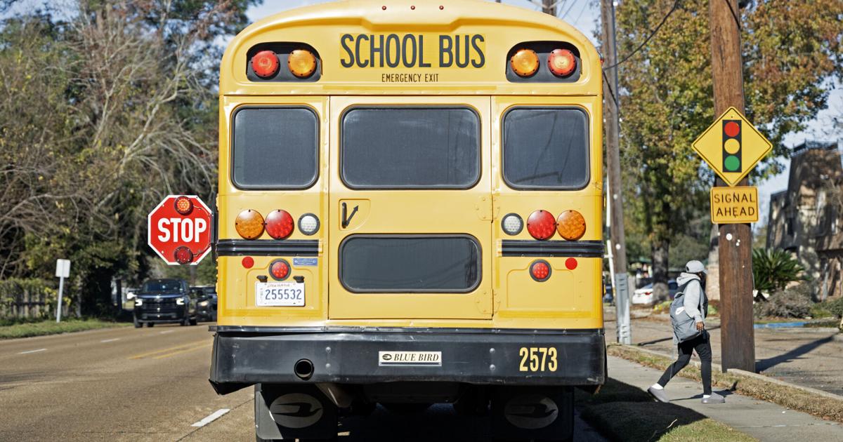 A student disembarks an East Baton Rouge Parish School Bus on College Drive, Thursday, January 16, 2025, in Baton Rouge, La.