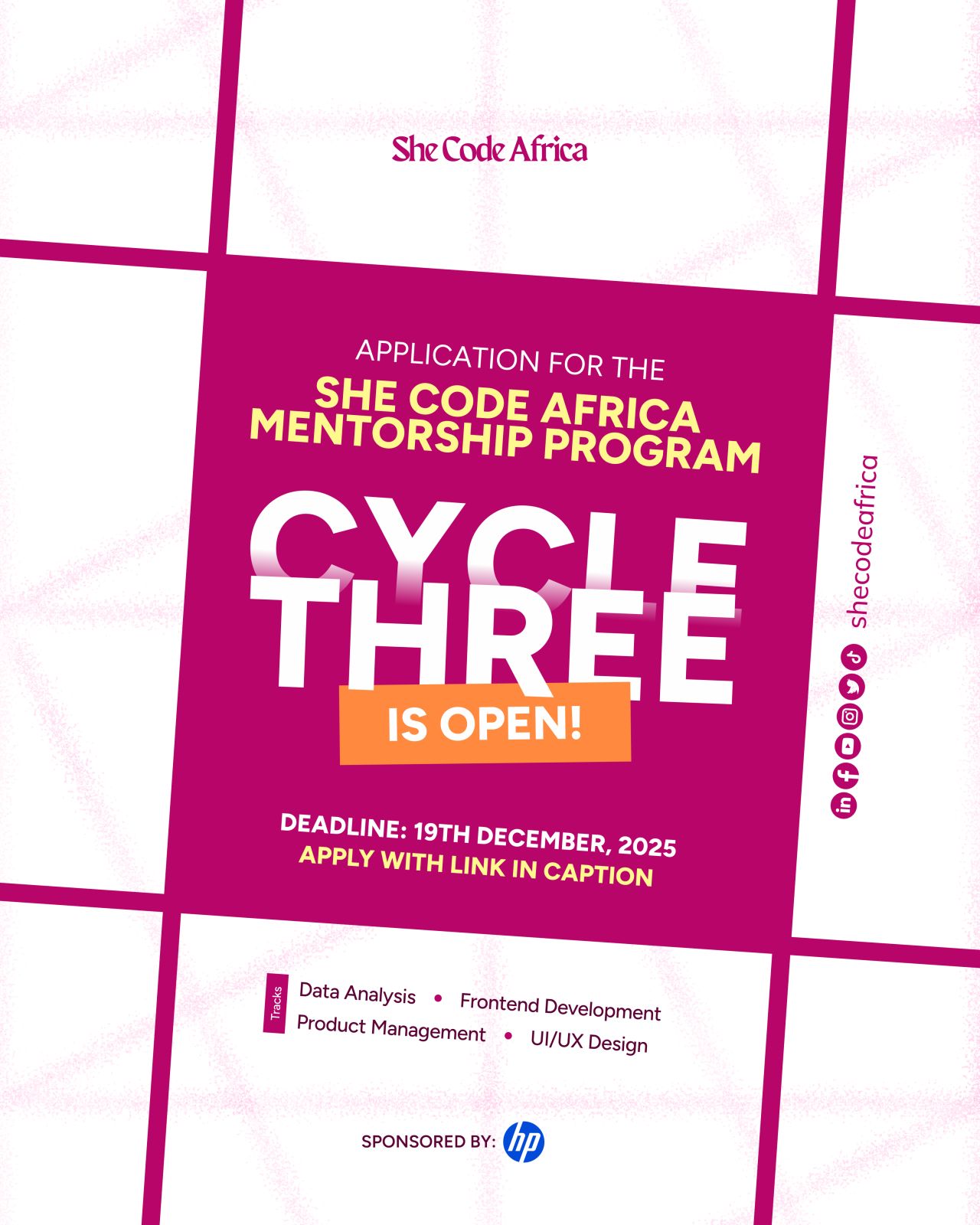The She Code Africa Mentorship Program has officially launched Cycle 3, offering another remarkable opportunity for women and girls across Africa to grow, upskill, and connect with experienced professionals in the tech space. This program continues to empower women in technology by providing guided learning, career exposure, and community support.