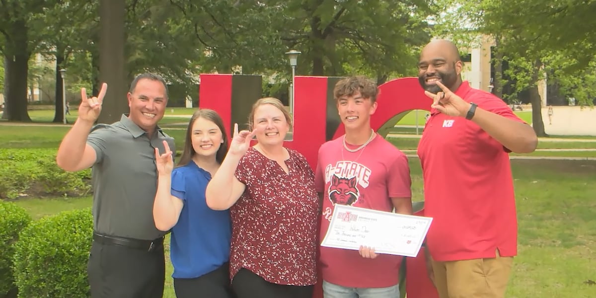 K8 Sports Anchor Charles McCary surprised Wilson Dean with the $10,000 scholarship while touring the campus at Arkansas State University.