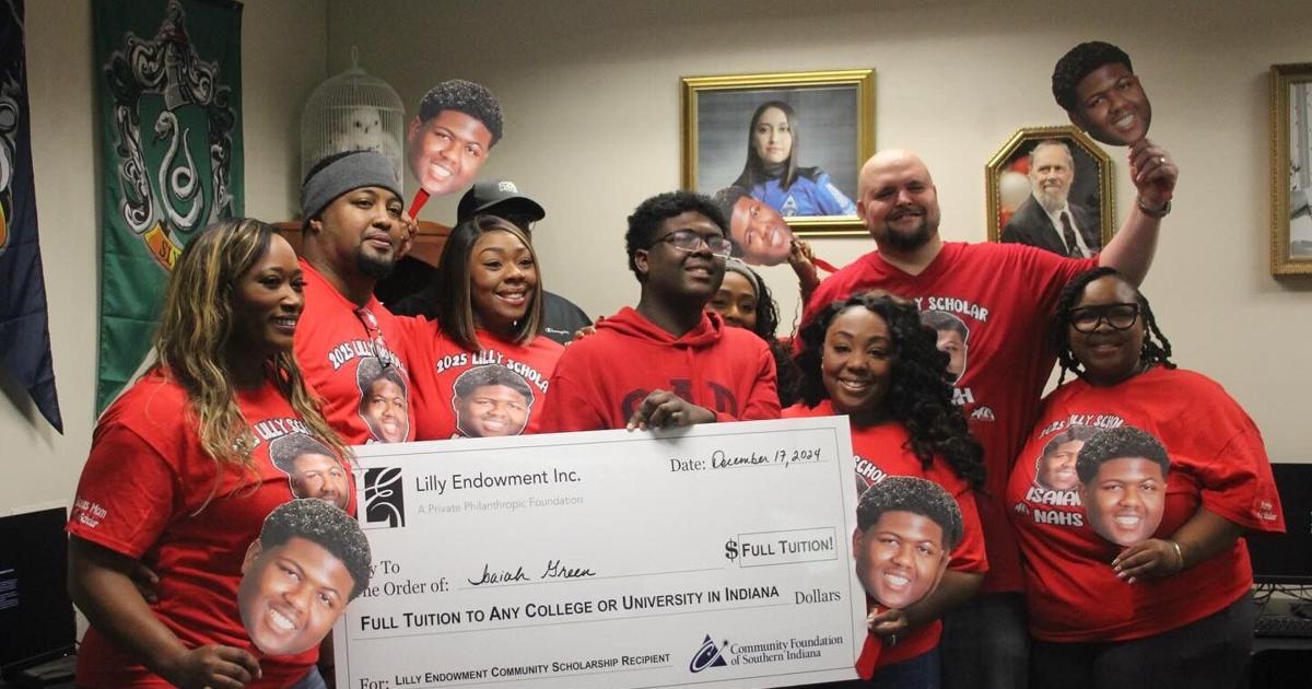 New Albany High School senior Isaiah Green celebrates with his family after learning he was named a Lilly Endowment Community Scholar on Tuesday.