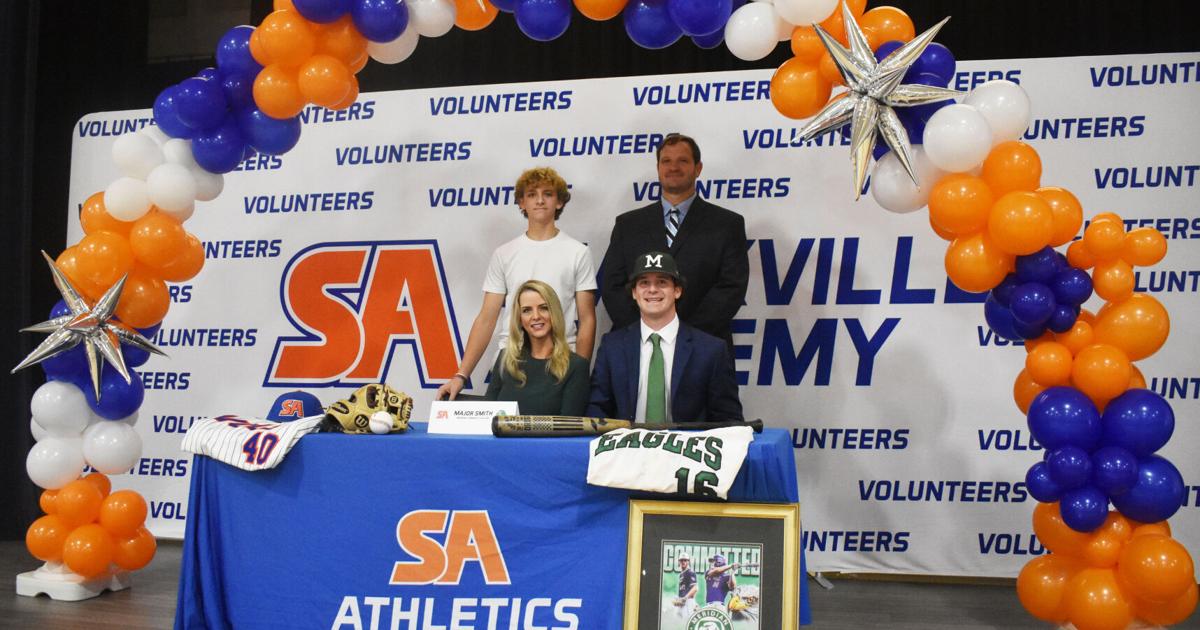 Starkville Academy baseball player Major Smith, seated right, celebrated his signing with Meridian Community College on Thursday morning at the Springer Center on campus and was supported by family, friends and coaches.