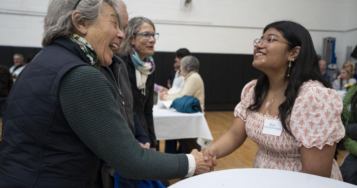Maria Gurrola Tzompa shakes hands with First in Family Scholarship representatives Monday evening during the 2025 Teton County Scholarship night at Jackson Hole High School.