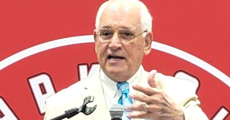 Troy University Chancellor Dr. Jack Hawkins addresses Ozark City Schools personnel during a breakfast meeting at the Ozark Civic Center at the beginning of the last school year.