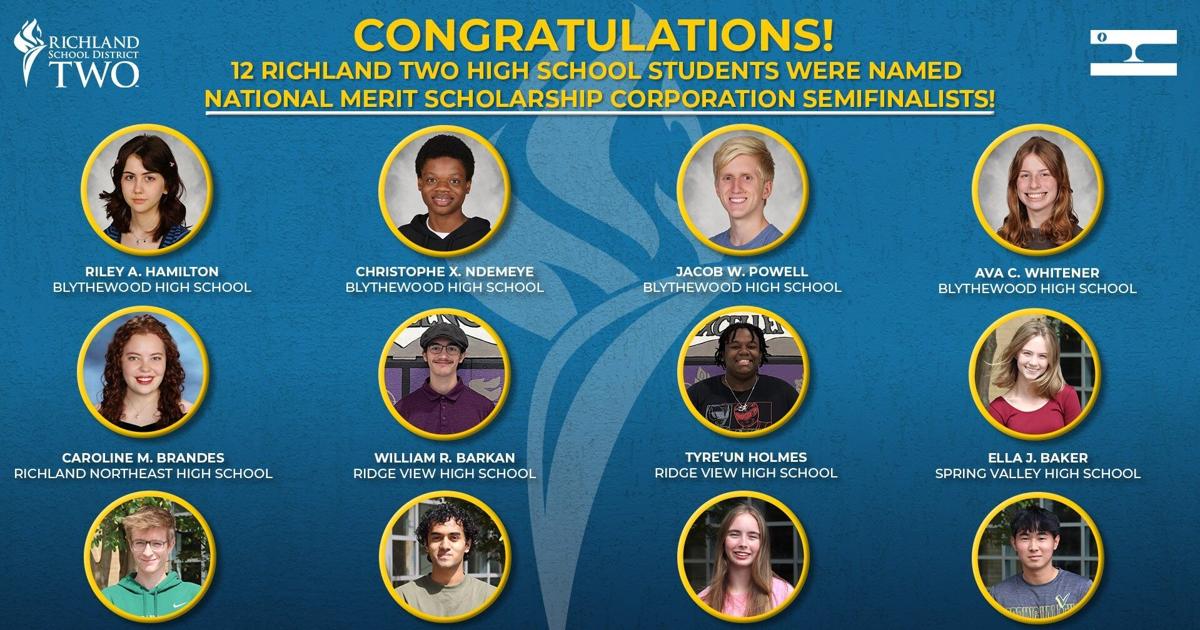 COLUMBIA, S.C. – The National Merit Scholarship Corporation (NMSC®) has named 12 students from Richland School District Two as semifinalists in the 71st annual National Merit Scholarship Program. These academically distinguished students are among 16,000 semifinalists nationwide who now can compete for approximately 6,930 scholarships valued at nearly $26 million.