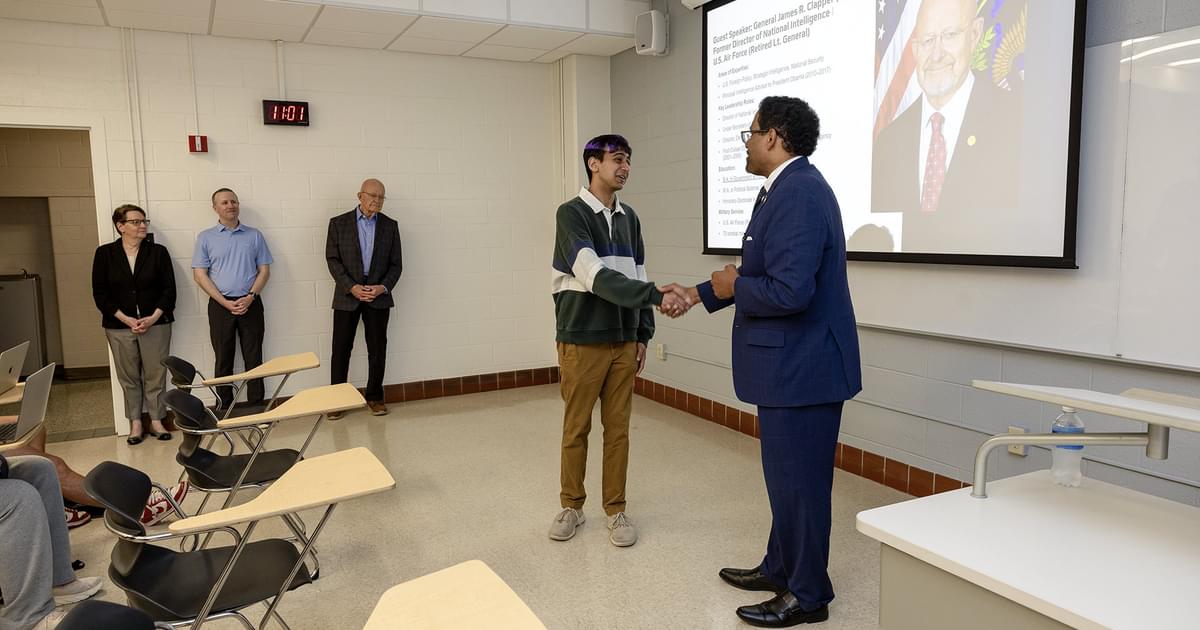 UMD President Darryll J. Pines (right) surprises junior Dhruvak Mirani with the news that he had been awarded a prestigious Truman Scholarship during a government and politics class. Among those present was a class visitor that day, retired Lt. Gen. James R. Clapper ’63 (center), a former U.S. director of national intelligence.