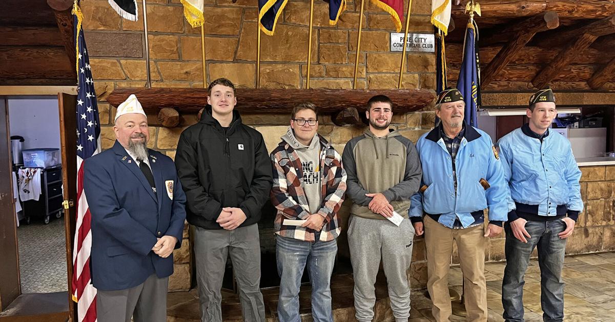 The Pine City VFW Post 4258 has awarded scholarships to three local students: Riley Cummings, Maddox Wiener and Nicholas Plasek. Cummings is attending Minnesota State University at Mankota, studying Civil Engineering. Wiener is attending Fond Du Lac Community College, studying Law Enforcement. Plasek is attending University of Minnesota Duluth, studying Health and Physical Education. Pictured left to right are VFW Commander David David, Riley Cummings, Maddox Wiener, Nicholas Plaske; Quarter Master Ed Sauter, and Senior Vice Commander Miles Holt.