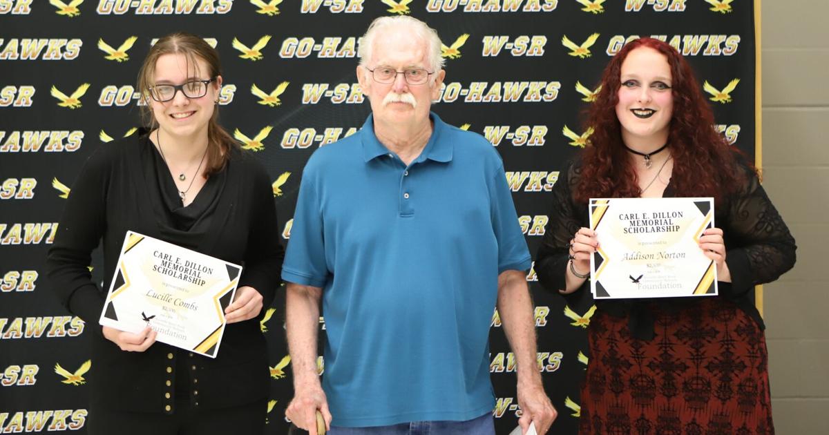 Carl E. Dillon Memorial Scholarships presented by Lynn Montague to Lucille Combs and Addison Norton. This scholarship is given to students pursuing a degree in fine arts.