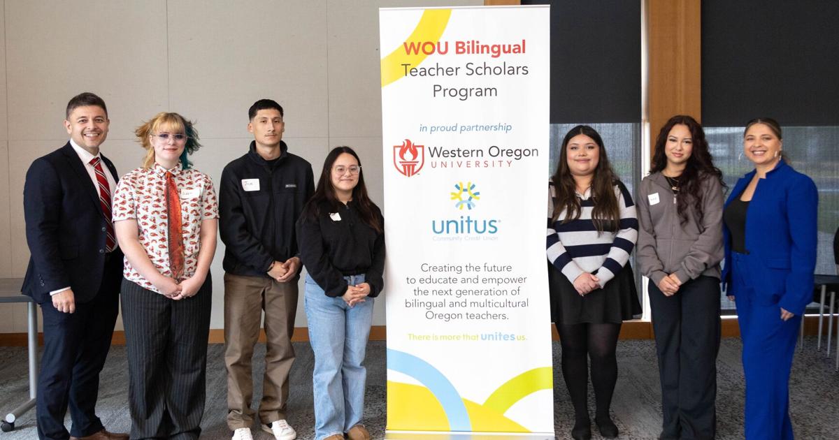 Western Oregon University students receiving the Unitus Bilingual Teacher Scholarship recipients are (from left) Juan Larios, Addison Berry, Jose Contreras, Evelyn Estrada, Alessandra Cervantes Ramirez, Monserrat Alvarez Hernandez, and Araceli Cruz.