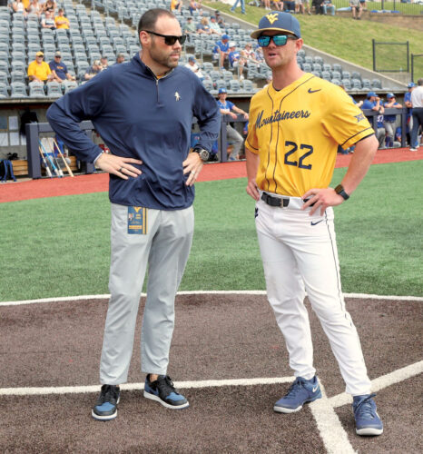 WVU director of athletics Wren Baker, left, talks with Mountaineer baseball coach Steve Sabins. (Photo by BlueGoldNews.com)